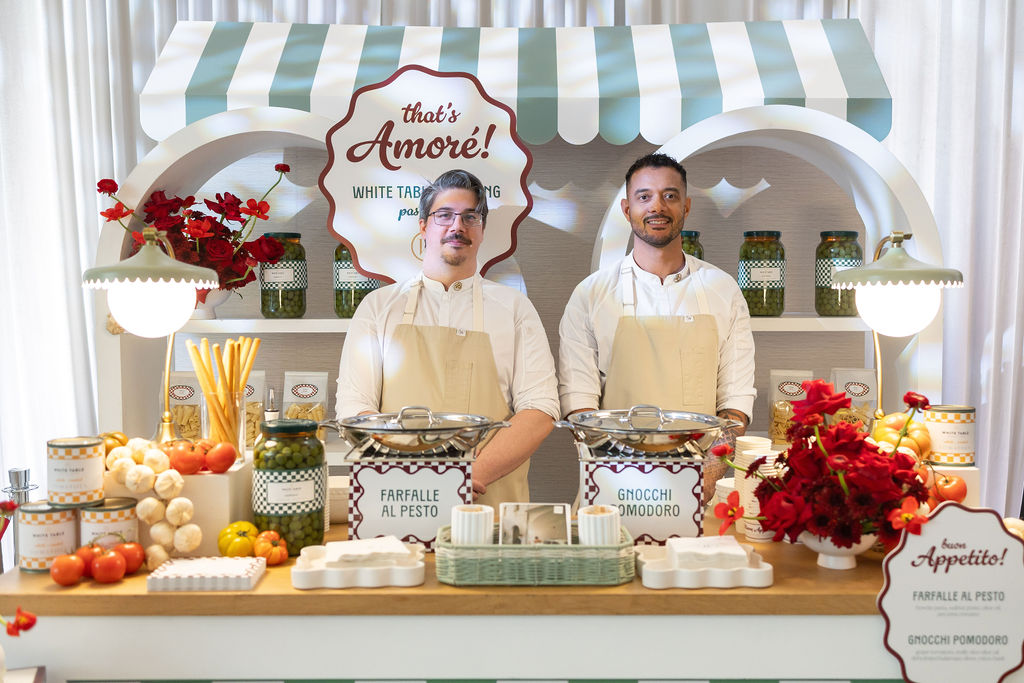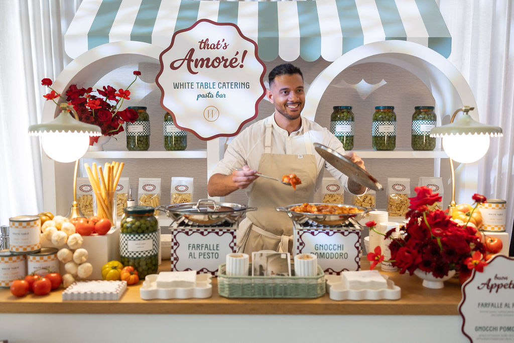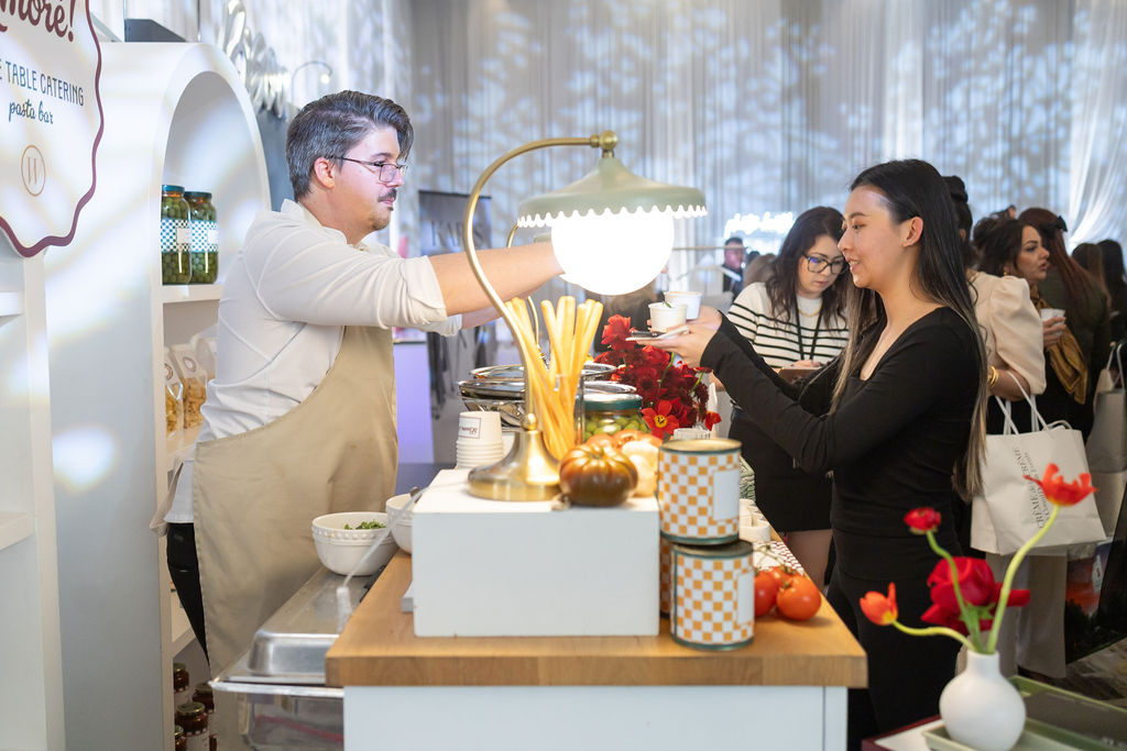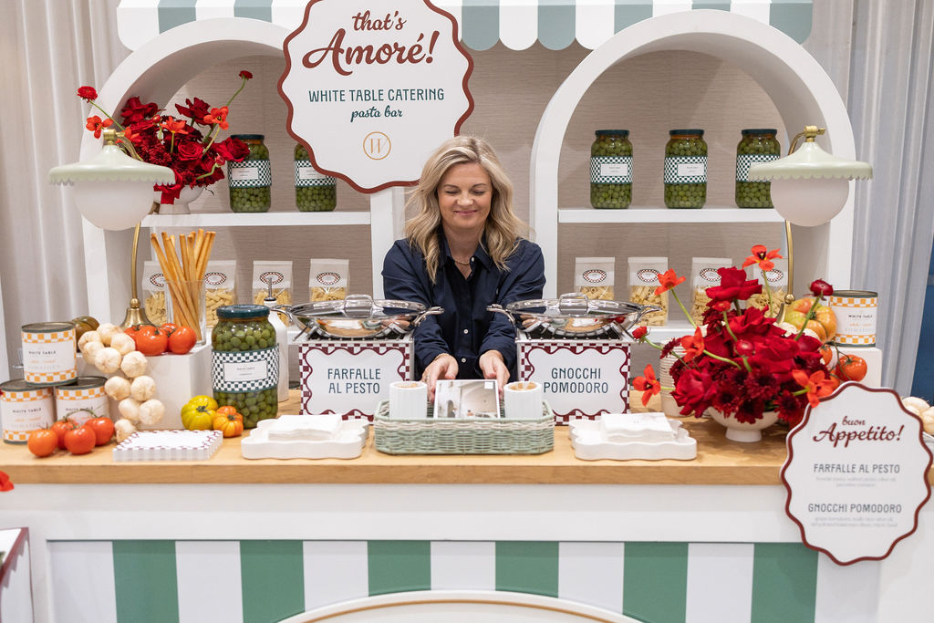 Attendees had the chance to enjoy a made-to-order pasta dish—choosing between Farfalle al Pesto or Gnocchi Pomodoro—while exploring a space filled with sensory storytelling. It was the perfect way to showcase what makes White Table Catering more than just catering: it’s design, creativity, and hospitality, all rolled into one beautiful experience.